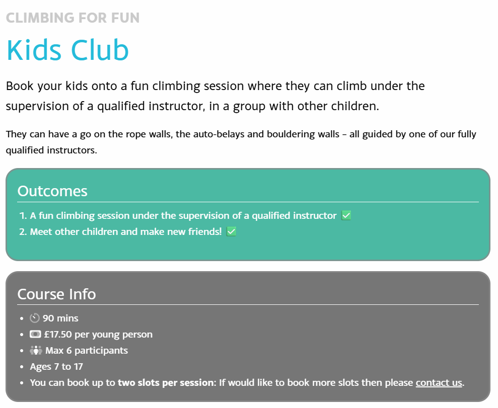 Please use this link for full details: The Reach Climbing Wall: Boulder, Lead, Top-rope, Autobelays